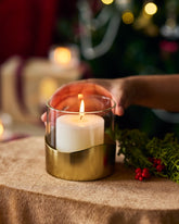 Perfect for contemporary spaces, this lantern adds refined elegance while accommodating standard pillar candles. The protective glass enclosure ensures safe burning while the distinctive gold base provides both stability and style.