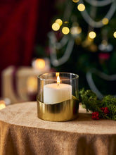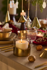 Elevate your space with our Wave Lantern, where modern sophistication meets artistic detail. The clear glass cylinder rests atop a brushed gold metal base adorned with fluid ripples that catch and reflect light beautifully. The seamless blend of transparent glass and textured metallic elements creates an enchanting display as candlelight illuminates the luxurious design.
