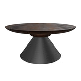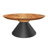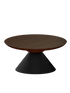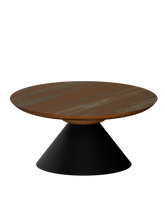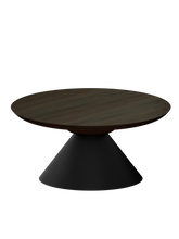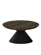The Perisi Coffee Table starts with a thick wood top with a demi-bullnose edge giving it a soft yet great character. Followed by a playfully round block of wood which finally rests on a wide conical metal base.