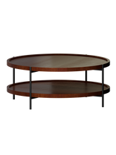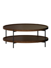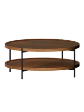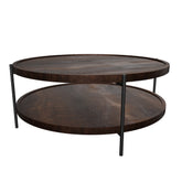 Two-tiered round coffee table with wooden top and metal frame on a white background