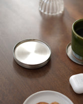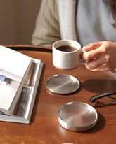 A set of 6 clean and minimal coasters to add a hint of luxury to your everyday life. These elegant stainless steel coasters are crafted from premium-grade stainless steel, featuring a beautifully brushed finish with a subtle circular pattern. The durable metallic surface resists tarnishing and maintains its refined appearance over time. Each coaster is backed with protective cork to safeguard your delicate surfaces from scratches and moisture. Perfect for elevating your coffee rituals and dining moments with understated sophistication.