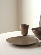 The matte bronze surface has a smooth, velvety texture with natural variations from the firing process. This versatile tableware works beautifully for both casual and formal dining, with its neutral bronze tone complementing any table setting.