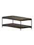 Elegant rectangular wood and metal coffee table with open shelf, styled in a modern neutral-toned living room.