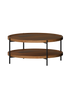 Round small wooden coffee table with metal frame and lower shelf in living room with a beige sofa in the background.