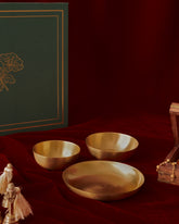 Box Contents: 1 x Heirloom Brass Bowl, small + 1 x Heirloom Brass Bowl, medium + 1 Heirloom Brass Tapas Plate