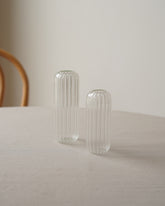 Two Kira glass tall bud vases - one small, one tall. Different shapes, same spirit. Perfect on a breakfast table or a windowsill, they speak of togetherness without saying much at all.
